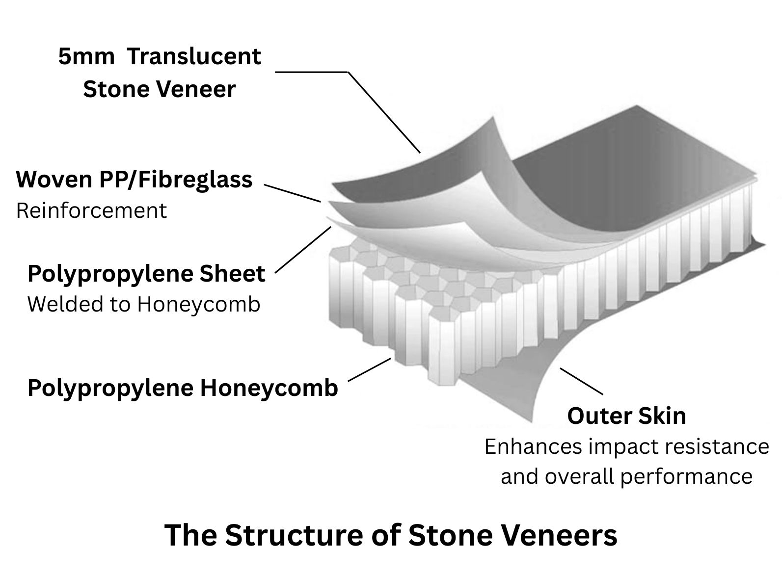 Begins with the stone material itself usually 2cm slabs which is fused to a translucent honeycomb to both faces, which adds exceptional strength to the otherwise fragile material.